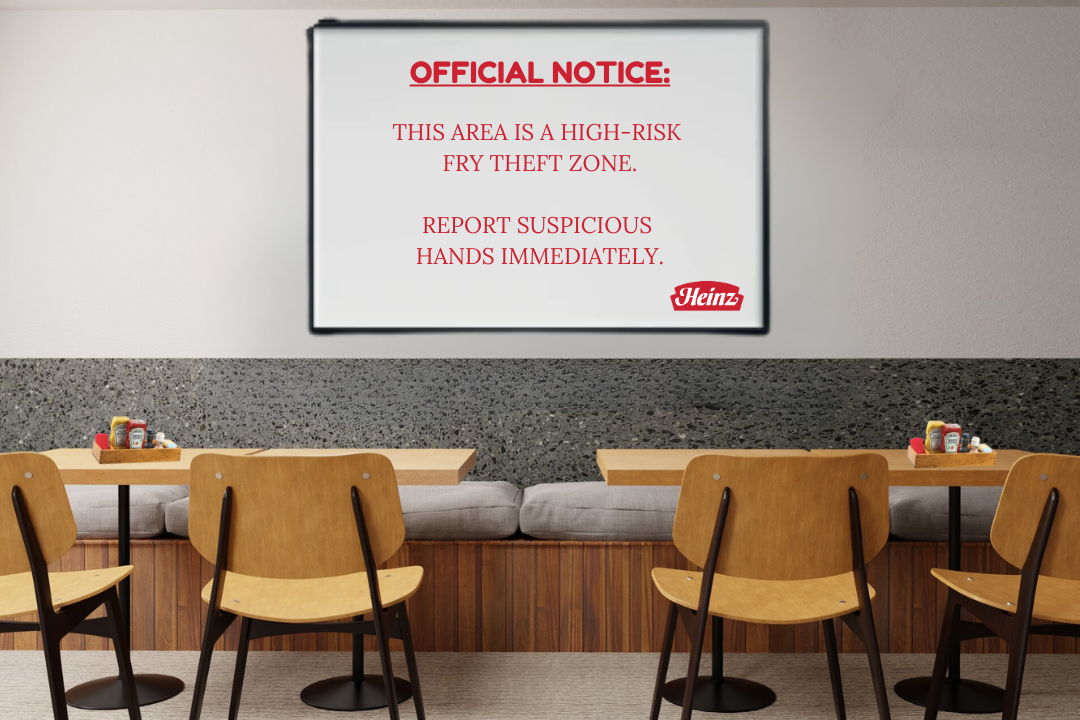 To bring this idea of life, Heinz turns fast-food restaurants into full fry-protection zones. Delivering official warnings, statistical reports, and crime-scene style notices everywhere fry theft actually happens.
